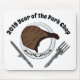 A crisp Pork chop for the year of the pig. Ok I admit when I bbq like to over cook the meat. This burnt piece of meat is on a white plate with a decorative knife and fork that has bird heads on them. With the changeable text that says "2019 the Year of the Pork Chop"