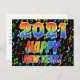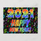 The front of this postcard design features the year number "2021" and the message "HAPPY NEW YEAR!" having a colorful rainbow spectrum inspired gradient pattern. The front also features a colorful pattern of musical notes and symbols of various sizes. The inside features a personalized New Year greeting message. A card like this might be used to send a New Year's Day message to somebody special.