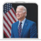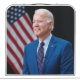 The photograph captures a moment in 2021 of President Joe Biden, image is now one of his official US Presidential photo. Sunlight streams through a window, casting a warm glow on the figure of an Biden standing confidently in the center of the frame. His arms are crossed, a gesture that suggests both authority and a hint of casual ease. --- Mr. Biden is dressed impeccably in a blue suit, the crisp fabric contrasting sharply with the clean lines of his white shirt. A blue and red striped tie adds a touch of personality to the ensemble. --- A glimpse of patriotism is evident in the background. An American flag stands proudly on a pole to the man's left, its vibrant colors a bold contrast to the solid black behind Joe. A closer look reveals a painting hanging on the wall, adding a touch of personal flair to the professional atmosphere. --- President Biden is the focal point of the image. His short white hair frames a kind face, etched with the lines of a life well-lived. A warm smile plays on his lips, conveying a sense of confidence, wisdom, and perhaps a hint of amusement.