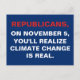 Climate change is real. Denying is delusion, and certainly doesn't help our kids, grandkids, and great grandkids. While a whole bunch of politicians, and to be honest, most of us, don't want to deal with the reality of climate change, we're never going to be able to start doing the hard stuff of reversing and preparing for the consequences of climate change if we keep voting in climate change deniers. And while we're being honest, let's recognize that most of those climate change deniers, and people blocking our ability to deal with climate change, are Republicans. And while we can all work on reversing climate change, we can also work on creating a change in our political climate, away from people who want to peddle in denialism, delusion, and conspiracy. Your vote matters, make it count. Design description: A simple design of red and white all capitals text in an easy to read sans serif font. The text reads, "Republicans, on [election date template], you'll realize climate change is real." The election date template lets you customize this for your local, primary, or general election date. As shown, it's customized for the 2024 presidential general election on November 5.