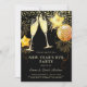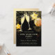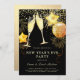 A modern New Year's eve invitation featuring champagne glasses, balloons, and glitter with bursts of fireworks on a black background. Platinum faux gold foil on the back of the invitation.