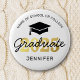 Custom graduation button featuring a graduate cap, 2025 in faux gold, school name, students name, and the word graduate in a script font.