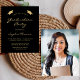 This classic, modern graduation party invitation features gold-colored text on a black background. The word "Graduation" and the name of the graduate appear in casual modern handwriting font beneath a pair of gold mortar board caps. Customize the invitation with party details, and replace the sample image on the back with a photo of your grad.