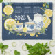 This beautifully illustrated 2025 calendar tea towel design radiates charm with its vibrant lemon theme. Framed by lush lemon branches and slices, the artwork pairs fresh, zesty citrus tones with delicate blue tea sets