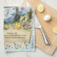Blue damask kitchen towel/calendar towel. Proverbs 16:9 “In their hearts humans plan their course, but the LORD establishes their steps." Hourglass with Alpine scene, pine trees, daisies, bird and scripture scroll.