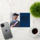 Elegant and modern custom gold foil graduation thank you note cards can be personalized with the graduate's photo, name, and school. Navy blue background color can be modified. Customize to add a custom thank you message or write a handwritten note inside the card.
