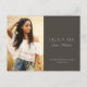 This minimalist graduation announcement postcard features simple typography and a cream and ash brown-gray color palette. On the front, a vertical photo is displayed on the left side. To the right, "Graduate" is written in modern all caps typography, with the grad's name written in calligraphy below. At the bottom, add the graduate's school and graduation year. The typography is cream against a dark brown-gray background. On the back of the grad postcard you can add a message to recipients and/or graduation party information.