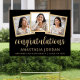 This graduation yard sign features a collage of three custom square photos above the word "congratulations" in elegant gold-colored calligraphy script on a black background. Add the graduate's name, school and class year below in sans serif font.