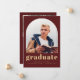 This simple, minimalist graduation announcement features an arch-shaped photo on the front and a horizontal photo on the back. The word "graduate" appears in bold gold-colored typography, with the graduate's name, school and year in sans serif font on a burgundy background. Add a a more detailed message under the photo on the reverse.