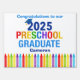 This fun customizable 2025 preschool graduation yard sign features a cool grad cap above colorful writing and a row of crayons in rainbow. Cute Pre-K graduate sign in fun colors with your kid's name personalized in blue. Congratulations to our preK grad!