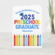This fun 2025 preschool graduation card features a cool grad cap above colorful writing and a row of crayons in rainbow. Cute customizable Pre-K graduate congratulations card in fun colors for your preschooler with your kid's name personalized in blue. Congratulations to our PreK grad!