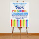 This cute welcome to our 2025 preschool graduation foam board sign features a cool grad cap above colorful writing and a row of crayons in rainbow. Great Pre-K graduates congratulations signage in fun colors for the last day of elementary school with your own inspirational quote personalized in blue. Congratulations to our preschooler grads!