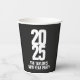 2025 New Year's Eve white text on black custom event paper cups. Personalize with your own event details.