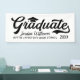 Graduation party banner feature a simple and stylish typography design with scholarly script "Graduate" wording and a grad cap with tassel accent. Personalize with your graduate's name, class year, and high school. Note, the black and white colors can be changed to match school or party colors.