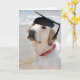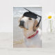 Labrador retriever with black graduation cap and red collar on the beach for 2026 graduate.