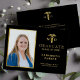 Modern elegant faux gold and black 2025 2026 medical school caduceus graduation announcement card template with your custom photo and text.