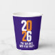 2026 New Year's Eve white and orange text design on dark blue custom event paper cups. Personalize with your own event details. Other matching items are available. Design by www.mylittleeden.com