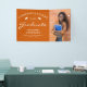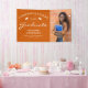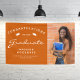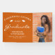 Celebrate your graduate's milestone in style with this graduation party banner. The left side features the words "Congratulations to our Graduate" in white text decorated with a pair of white mortar board caps on a burnt orange background, while a vertical photo of the grad appears on the right. Personalize it with your grad's name, school, and year of graduation.