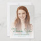 Trendy modern graduation thank-you card featuring a custom vertical photo. The words "Thank You" appear in green handwriting script overlay, with the graduate's name and year of graduation below in sans serif font. Easily replace the sample image with your own graduate's photo. A white gradient screen helps ensure the text pops. The reverse side features a green dripping faux glitter border on an ombre background. Customize the text with your own thank-you note, or delete it to provide room for individual handwritten messages.