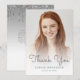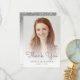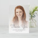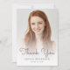 Trendy modern graduation thank-you card featuring a custom vertical photo. The words "Thank You" appear in gray handwriting script overlay, with the graduate's name and year of graduation below in sans serif font. Easily replace the sample image with your own graduate's photo. A white gradient screen helps ensure the text pops. The reverse side features a silver dripping faux glitter border on an ombre background. Customize the text with your own thank-you note, or delete it to provide room for individual handwritten messages.