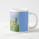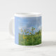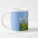 A field of yellow wildflowers under a rainbow sky covers the front of this mug.