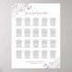 This wedding seating chart features table assignments for 200 guests, with 10 people at each table. The design is simple yet elegant with dark gray and light purple or lavender text on a white background. There are frilly silver faux foil curls and swirls in the corners and elegant script calligraphy reading "please find your table." Beautiful addition to your wedding reception.