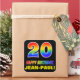 This fun, colorful, and cheerful birthday sticker design features a large number "20" and the message "HAPPY BIRTHDAY,", both colored with a rainbow spectrum gradient inspired pattern, along with a bold yellow custom name. The background is colored black. Fun stickers like this might be used when wrapping gifts being given to somebody in celebration of their 20th birthday, or perhaps maybe be given out to the attendees at a birthday celebration. [~Z0000480]