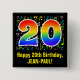 This fun, vibrant, and colorful birthday button design features a large number "20" having a rainbow spectrum gradient inspired pattern. It also features the message "Happy 20th Birthday,", and a custom name. Part of the background has a colorful music notes and symbols pattern. Buttons like this might be worn by the guests at a birthday party being held to celebrate a musician’s, a singer’s, a song composer’s, or somebody else’s twentieth birthday. [~Z0000424]