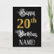 The front of this fancy and luxurious birthday themed greeting card design features the message “Happy 20th Birthday,”, plus a customizable recipient name. Some of the message is in an elegant script-style text. The large number “20th” features a faux/imitation gold-inspired look pattern. The background is colored black. The inside has a personalized birthday greeting message, or could perhaps be cleared and left blank if a message is to be written by hand instead. An elaborate, editable birthday greeting card like this might be a respectable way to send some birthday wishes to somebody who is celebrating their twentieth birthday. [~Z0000559]