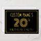 The front of this vintage-appearance and 1920s-1930s style inspired twentieth birthday party/celebration foil invitation features a customizable name, a large art deco style inspired number “20TH”, the message “BIRTHDAY PARTY!”, and a border pattern consisting of lines. The background of the front is colored black by default, but it can be customized to a different color if desired. The back features personalized details about the event, such as the date, time, location, and any other relevant information. Elegant, luxurious, customizable invitations like these might be used to invite guests to a birthday celebration/party being held in celebration of somebody’s 20th birthday. [~Z0000590]