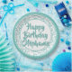 This numeric design has a teal and white random number pattern with a teal milestone number 20 repeated in varied sizes and angles. There is a white circle in the center for your text and teal-and-white rings around the rim.