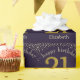 Number 21 in simulated glitter gold with falling diamonds on solid deep dark purple. Happy Birthday in open face off-white font. Personalize with recipient's names or personal message.