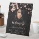 A welcome sign for a glamorous 21st birthday party. A classic black background decorated with rose gold stars. Personalize and add a photo and name. Number 21 is written with a balloon style font.