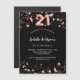 A classic black background, decorated with rose gold stars. Personalize and add a name and party details. Number 21 is written with a balloon style script.