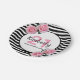 A paper plate for a 21st birthday party. Classic slim black and white horizontal stripes as background. With girly and feminine pink roses as decoration.