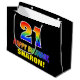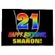 This colorful, cheerful, and fun birthday-themed gift bag design features a large number "21" and the message "HAPPY BIRTHDAY,", both having a rainbow spectrum gradient inspired pattern coloring, along with a bold yellow personalized recipient name. The background is colored black. A fun gift bag like this might be used when wrapping gifts being given to somebody in celebration of their twenty first birthday. [~Z0000477]