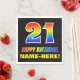 This cheerful, fun, and colorful birthday paper napkin design features a large number "21" and the message "HAPPY BIRTHDAY,", both having a rainbow spectrum gradient inspired pattern coloring, along with a bold yellow custom recipient name. The background is colored black. Birthday themed paper napkins like this might be fun to use at a party being held to celebrate somebody’s 21st birthday. [~Z0000476]