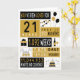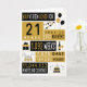 A black and gold color scheme birthday greeting card for anyone who is turning twenty-one (21). Matched with balloons, buntings, gift box, wine, wine glass, and a cake.