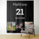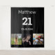 For a 21st birthday party. A collage of 3 of your photos of himself friends, family, interest or pets. Personalize and add his name, age 21 and a date. Date of birth or the date of the birthday party. Black background. White colored text.