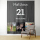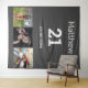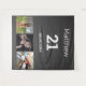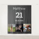 For a 21st birthday party. A collage of 3 of your photos of himself friends, family, interest or pets. Personalize and add his name, age 21 and a date. Date of birth or the date of the birthday party. Gray background. White colored text.