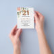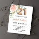 An elegant invitation for a 21st birthday party. A chic white background. Decorated with a rose gold and blush pink watercolored rose flower, floral, green eucalyptus leaves, sprigs, greenery and faux gold sprigs. Personalize and the name and party details. Black and golden letters. The name is written with a modern hand lettered style script. Number 21 is written with a golden balloon style font.
