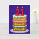 The front of this cheerful and upbeat birthday-themed greeting card design features a depiction of a three-tier birthday cake having number-shaped candles on top showing the age “21“, along with the message “HAPPY 21ST BIRTHDAY,”, and a personalized recipient name. The inside features a customized birthday greeting message, or could perhaps be cleared and left blank if a message is to be written by hand instead. A joyful, personalized birthday greeting card like this might be used to acknowledge somebody’s twenty-first birthday. [~Z0000620]