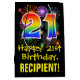 This exciting, fun, and colorful birthday giftbag design features a large number "21" with a rainbow spectrum gradient inspired pattern, along with the message "Happy 21st Birthday,", and a personalized recipient name. It also has a colorful bursting celebratory fireworks inspired background pattern. A gift bag like this might be used when giving a gift or present in honor of somebody’s 21st birthday. [~Z0000509]