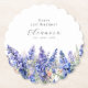 Perfect table decor for a July birthday party. Blue larkspur (delphinium) is the birth flower for that month. It forms a pretty watercolor bottom border on this floral personalized round coaster with scalloped edges. The birthday celebrant's name, age and birthdate are placed above it using elegant calligraphy and typography. All text is editable.