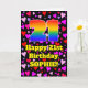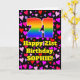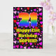 The front of this fun and happy birthday greeting card design features a large number “21” with a rainbow spectrum gradient inspired pattern, along with the message “Happy 21st Birthday,”, and an editable name. The background of the front features a pattern of red, purple, and pink heart shapes of various sizes. The inside has a customizable birthday greeting message, or could perhaps be cleared and left blank if a message is to be written by hand instead. A fun, customized birthday greeting card like this might be sent in celebration of somebody’s twenty-first birthday. [~Z0000551]
