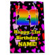 This colorful and cheerful birthday-themed gift bag design features a large number “21” having a rainbow spectrum gradient inspired pattern. It also features the message “Happy 21st Birthday,”, and an editable name. The background features a pattern of heart shapes with colors like red, pink, and purple. A fun gift bag like this might be a fun way of wrapping a birthday present or gift being given to somebody who is celebrating their 21st birthday. [~Z0000551]
