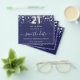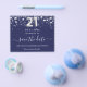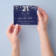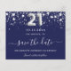 A girly and trendy Save the Date for a 21st birthday party. A navy blue colored background. Decorated with faux silver stars. The text: Save the Date is written with a large trendy hand lettered style script. Number 21 is written with a balloon style font.