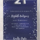A navy blue background, decorated with stars. The blue color is uneven. Personalize and add names, party details, RSVP date, return address and name. Number 21 is written with a balloon style font.