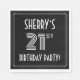This luxurious and 1920s/1930s style inspired twenty-first birthday celebration/party paper napkin design features an editable name, a fancy art deco look inspired number “21st”, the message “BIRTHDAY PARTY!”, and a border pattern consisting of lines. The background is colored black by default, but it can be customized to a different color, if desired. Birthday themed paper napkins like these might be used at a party celebrating somebody’s twenty first birthday. [~Z0000616]