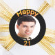 A sticker for a 21st birthday party for guys. Template for your photo. Black background and the text: Happy 21. The text is written with a trendy faux gold balloon script.